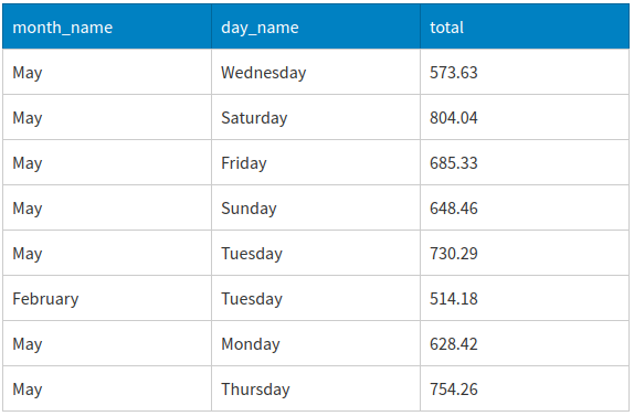 NULLvalue for the 'day_name' column has summary totals at the month level in the 'total' column. The MySQL documentation refers to rows like these as having super-aggregation.Rows having a non-