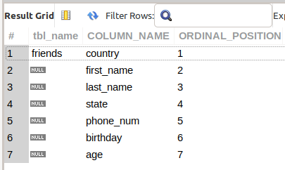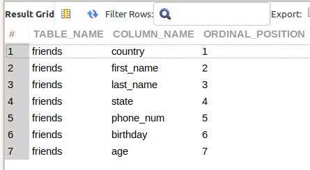 I am using an arbitrary āfriendsā table for the example. We can get the table name, all column names, and the columnsā individual position within the table by executing this query against the INFORMATION_SCHEMA database COLUMNS table (with a user that has permissions):