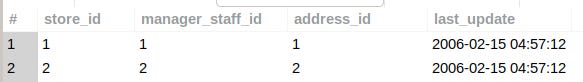 For the example select() queries, I am using the Sakila database 'store' table with this data: